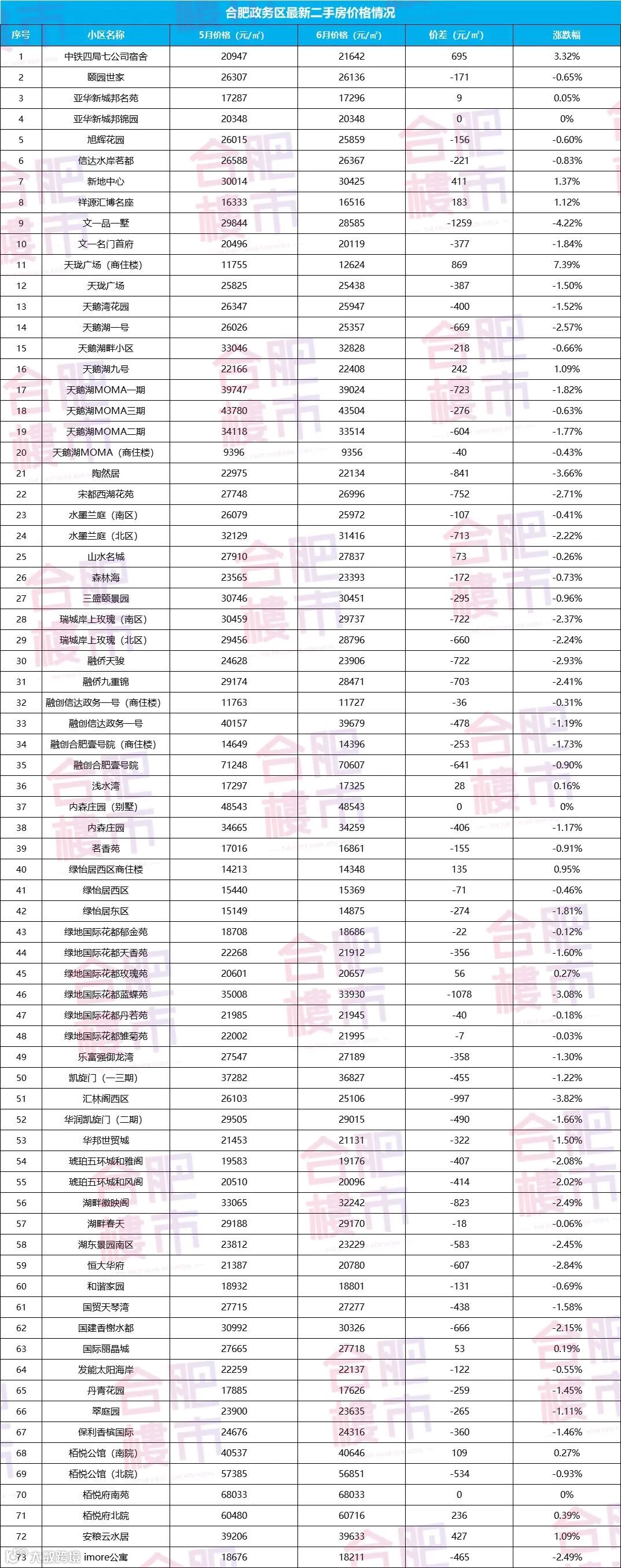 那最新政务区二手房小区价格如何呢,根据安居客挂牌数据,这里统计了6月份对比5月份的数据,仅供参考。