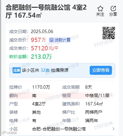 上个月初,政务区合肥融创一号院融公馆成交一套167.54㎡房源,成交总价957万,成交单价57120元/㎡。