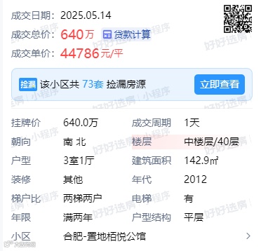 置地栢悦公馆小区一套142.9㎡房源,成交总价640万,成交单价44786元/㎡。