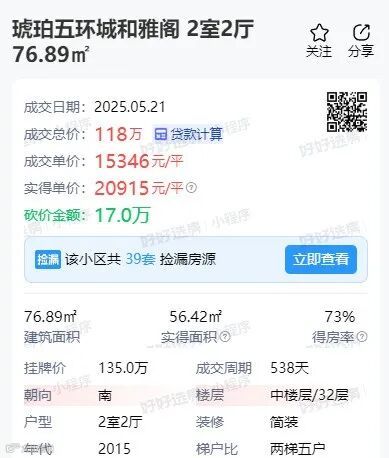 琥珀五环城和雅阁一套76.89㎡房源,成交总价118万,成交单价15346元/㎡。