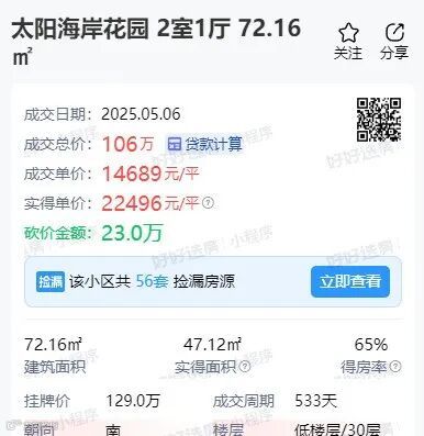 太阳海岸花园一套72.16㎡房源,成交总价106万,成交单价14689元/㎡。