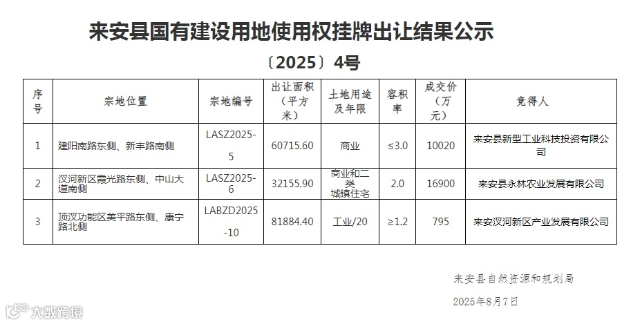2025年8月7日,滁州市来安县自然资源和规划局发布一则国有建设用地使用权挂牌出让结果公示:位于汊河新区霞光路东侧、中山大道南侧的一幅优质地块,由本土企业来安县永林农业发展有限公司以1.69亿元成功竞得。