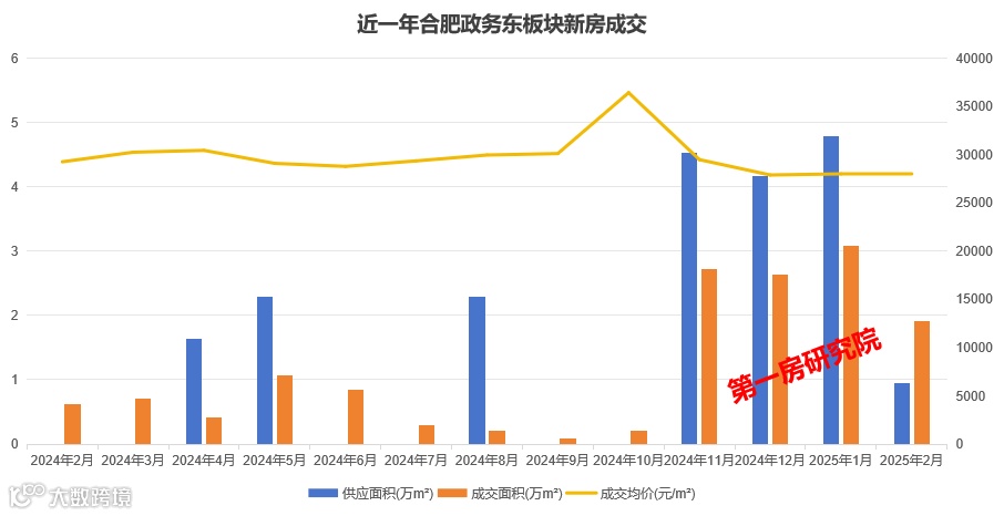 政务东板块的新房市场去年的供应量也是较为充足,2024年新房供应19.7万m²,成交备案12.8万m²。江淮三子入市后,11、12、1月的成交量明显增加。2025年1月新房成交环比增长17%,成交均价也是稳定在2.78万/m²,2月年后的供应较少,成交同比增长200%。该板块也是很多改善客群重点关注之一。