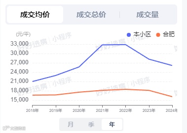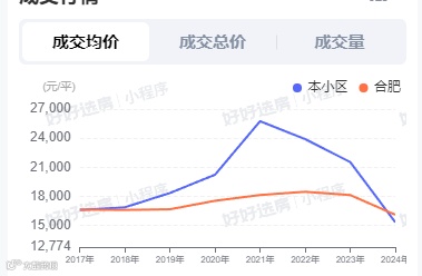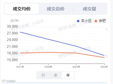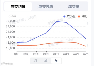 临湖苑即是当初的万达文旅新城,想当初首次开盘万人摇号,也创造了合肥楼市销售传奇,从近几年房价走势来看,2019年到2022年该小区的不论成交价格还是挂牌价格都在上涨,2022年开始小区价格开始大幅下跌,2022年小区挂牌价格破3万/㎡,成交价格约2.4万/㎡,到2023年成交价格跌破2万/㎡,2024年成交价格已经跌到1.5万/㎡,部分房源价格甚至更低。