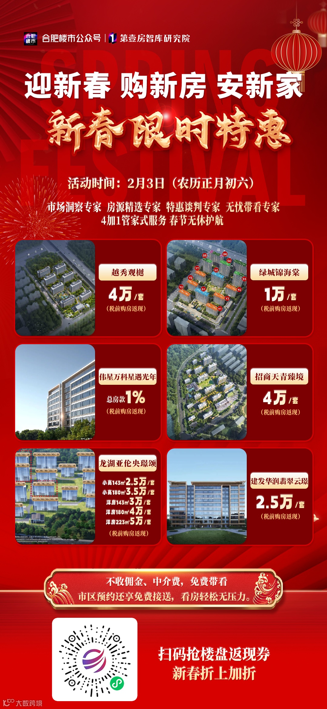 2025 年新春置业购房节活动持续进行,本次活动合肥在售的45家房企约77个项目参与,本次参与项目低至8折专属优惠,更有一口价秒杀房源,购房送车位、赠送品牌家电以及人才补贴等多重优惠。另外,通过第一房获客宝领取购房券还可以享受4+1线上咨询服务,以及专车免费接送看房线下服务。