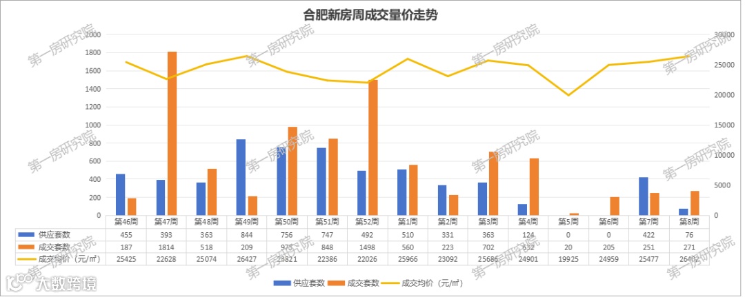 合肥二手房市场节后迅速回暖,与此同时,新房市场也开始逐渐回升,上周合肥新房量价齐涨。根据第一房研究院AI指数系统统计数据显示,上周合肥新房成交271套房源,环比上涨约8%;成交均价26402元/㎡,环比上涨3.6%。