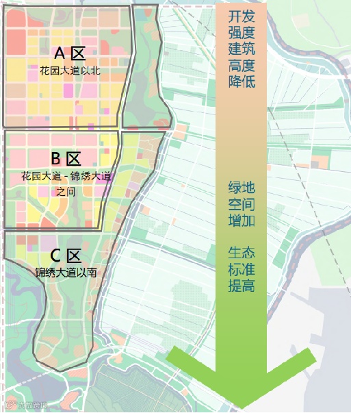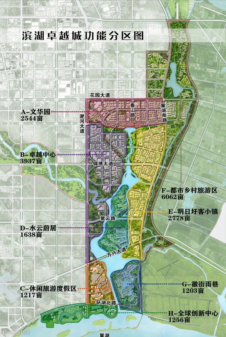 文华园、卓越中心、金融小镇、圩美磨滩度假区、卓越溪生态公园、明日圩客小镇、合杭梦想小镇、十五里河生态走廊多元融合。