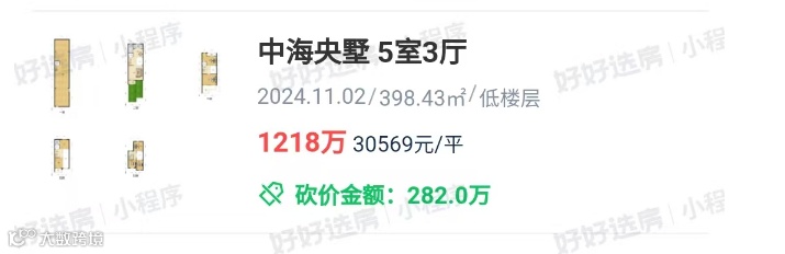 中海央墅近期成交了一套房源,5室3厅、398.43m²、1218万,大概3万/m²。对比当时新房均价2.2万/m²,涨了40%。