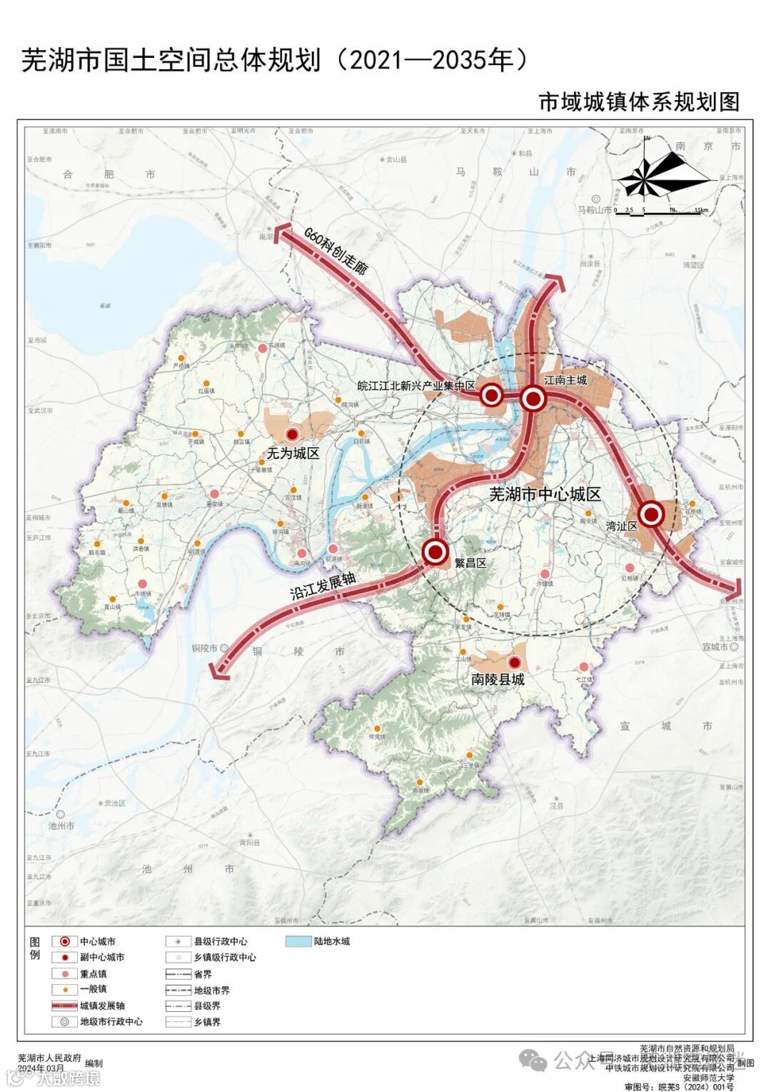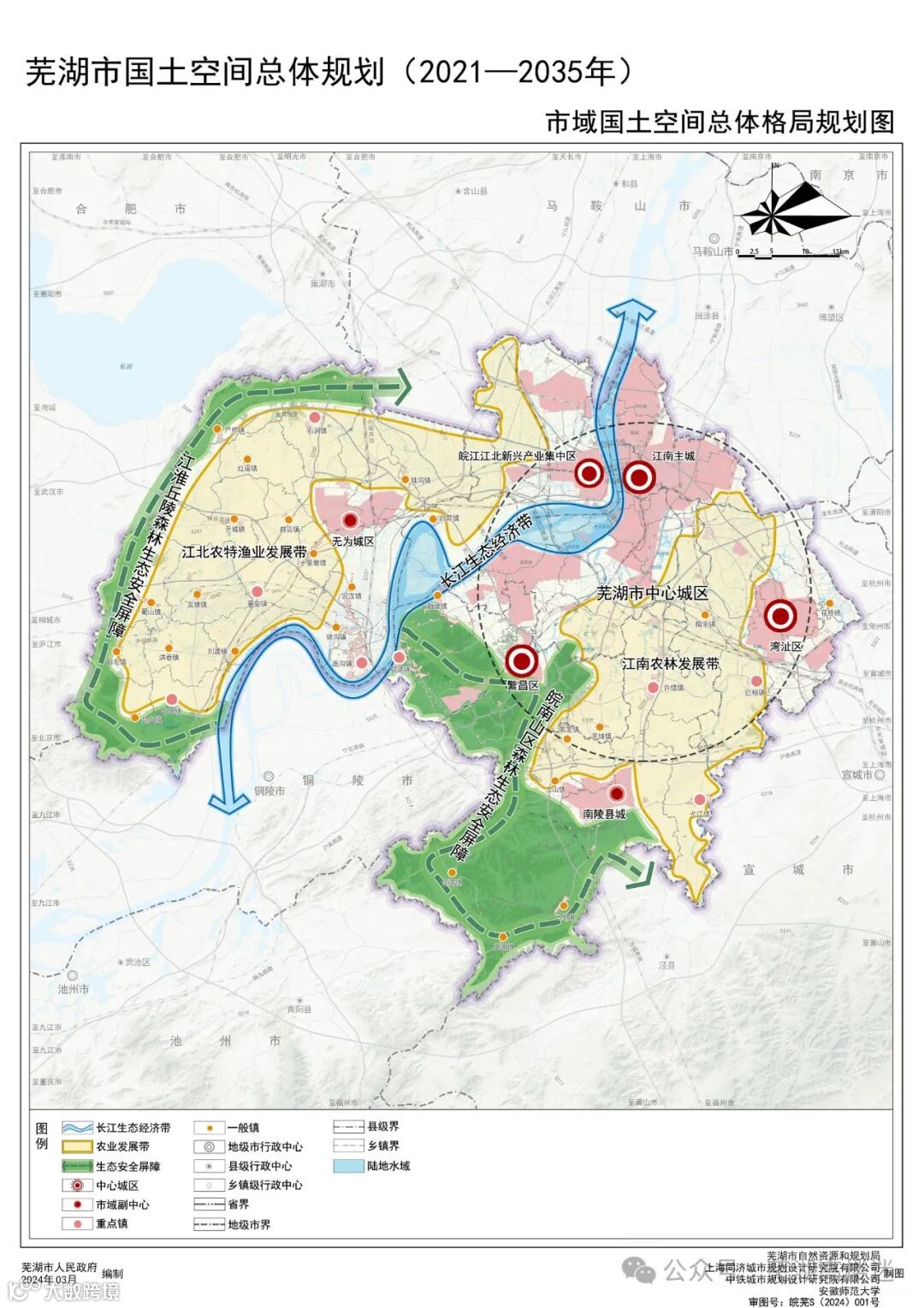 城镇空间:形成“一主两副、双轴多点”格局,中心城区“西进、南扩、中提升”,江北新区、三山开发区等成为新兴增长极,严控城镇开发边界无序扩张。