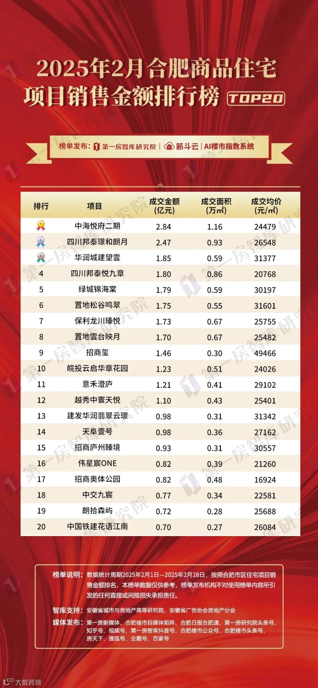 具体来看,前三房企成交金额在4亿元以上,其中合肥城建以4.88亿排名第一,主要还是以合作项目为主,淝河板块的中海悦府二期以及金融板块望雲是成交的主力。四川邦泰目前在售的两个项目四川邦泰璟和朗月和悦九章都是新计容项目,热度也比较高。招商主要贡献是招商玺和新站招商奥体公园,安徽置地贡献较大的是明珠广场置地松谷鸣翠和省府北置地雲台映月,保利、皖投、中海、华润2月销售超过3亿。
