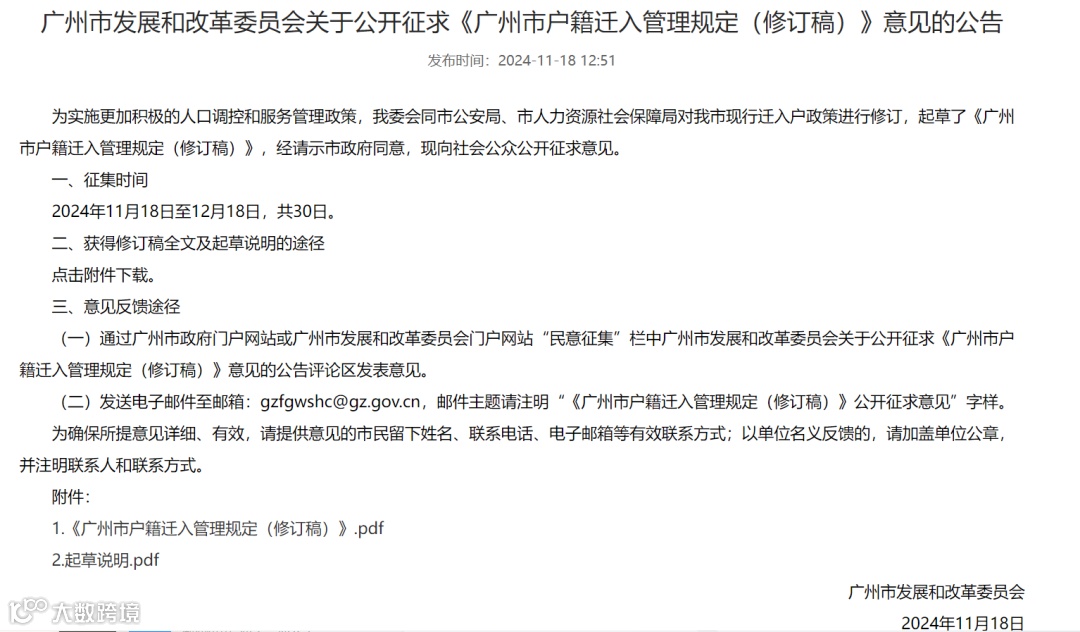 同时,广州市发展和改革委员会也发布了《规定(修订稿)》,提出新增安居乐业、投资纳税两种入户政策,取消积分制入户年度名额限制、允许全日制大专学历入户广州等修订内容。