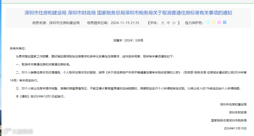 11月19日,深圳也发布自2024年12月1日起取消普通住房和非普通住房标准。同时对个人转让住房未提供完整、准确的房屋原值凭证,不能正确计算房屋原值和应纳税额的,根据规定实行个人所得税核定征税,以转让收入的1%核定应纳个人所得税额。