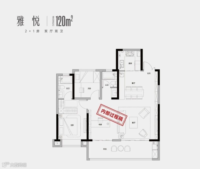 包河区的棠悦风华是毛坯在价格方面有优势,相同价格面积可以选大点。例如下面这个120m²,2+1房,其实就是可以给书房做成卧室,并且两厅两卫,这个户型北侧还有超大的阳台,主卧套房还是南北通的。所以这个户型就很适合网友的需求,并且学区也可以。