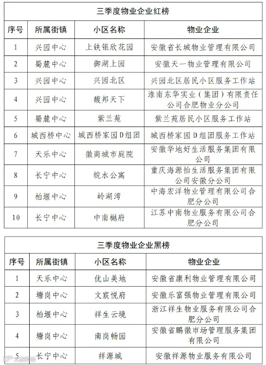 “好房新选”专家:物业也是一直购房者买房关注的因素之一,最近合肥部分区域发布了三季度物业行业“红黄黑榜”,如下。