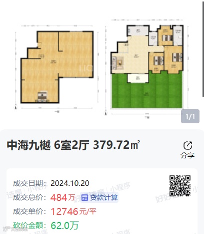 中海九樾一套379.72㎡六室两厅洋房房源,该套房源今年以来历经7次降价,从挂牌618万降到546万,最终以484万总价成交,成交价格与当初挂牌价格降了134万,最终成交单价1.27万/㎡。