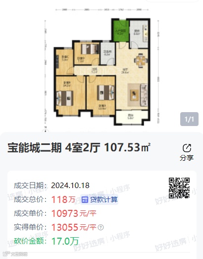 宝能城二期一套107.53㎡四室两厅房源,今年以来历经7次调价,挂牌价格约1.25万/㎡,最终以118万成交,成交单价仅1万/㎡。