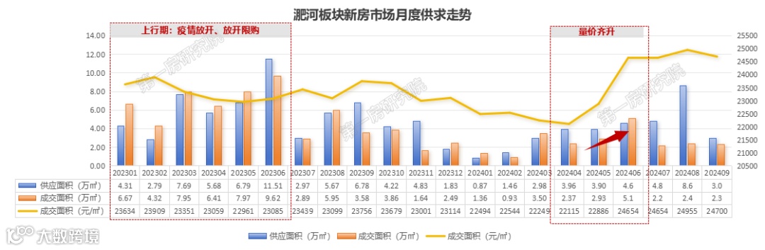 再来看看淝河板块市场,2023年淝河板块新房市场整体表现也是先扬后抑,1-6月份在疫情放开和率先放开限购的利好因素影响下,市场回暖明显。7-12月基本属于筑底期,一方面是市区全面解除限购政策,另一方面也是一二手房价格拉差进一步缩小,消费者观望情绪愈发严重。到了2024年,上半年在政策利好的加持下,市场出现了回暖,整体呈现出量价齐升的态势,但下半年又开始继续下跌,整体来看市场依然处于深度调整中,依然处于低位,有很大的上升空间。