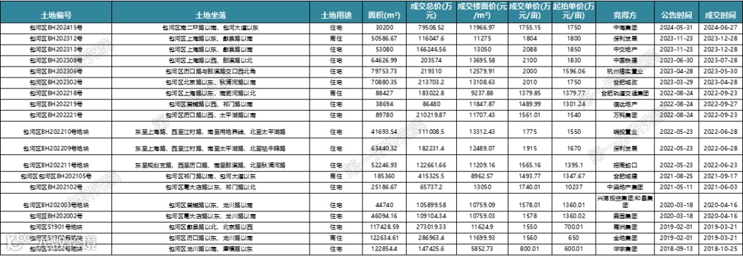 2022年和2023年是淝河板块土地市场较为活跃,2022年成交6宗地块,2023年成交5宗地块,这两年也是淝河市场较火的两年,2024年淝河板块仅成交1宗地块。从房企来看,淝河板块聚集保利、中海、招商、中国铁建等头部房企。从拿地价格来看,近几年淝河板块底价不断上涨,最高成交价已经突破2000万元/亩。