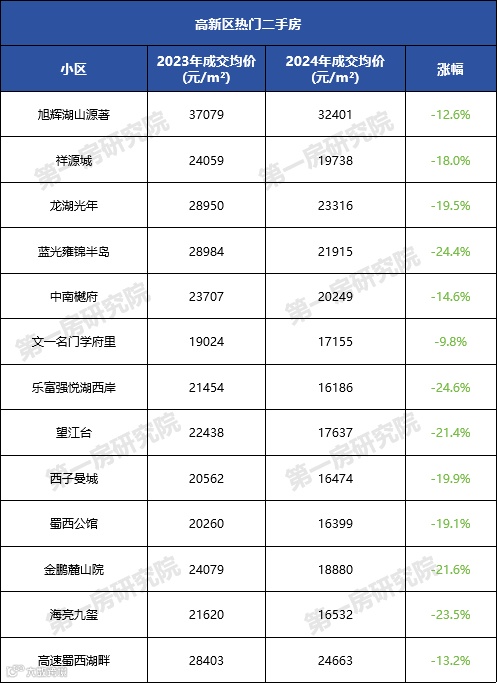 从列举的高新区热门二手房的两年的成交均价来看,均出现不同幅度的下滑,有的小区甚至下降近5000元/m²。