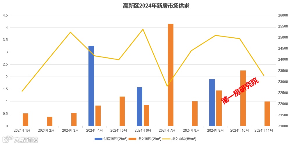 根据第一房研究院AI楼市指数系统显示,高新区近一年的新房供应较少,这也跟区域内目前的在售新房较少有关系,并且成交量自今年1-6月都比较低迷,在7月成交量“峰值”,主要是因为擢秀园在7月进行了集中备案,该项目是合肥人才房转公寓的项目之一,而且价格较周围的新房都低,所以很受市场欢迎。但成交均价也是下降明显,成交均价近一年在2.4万/m²上下浮动。11月高新区成交价下跌,成交量也下降,“量价齐跌”。