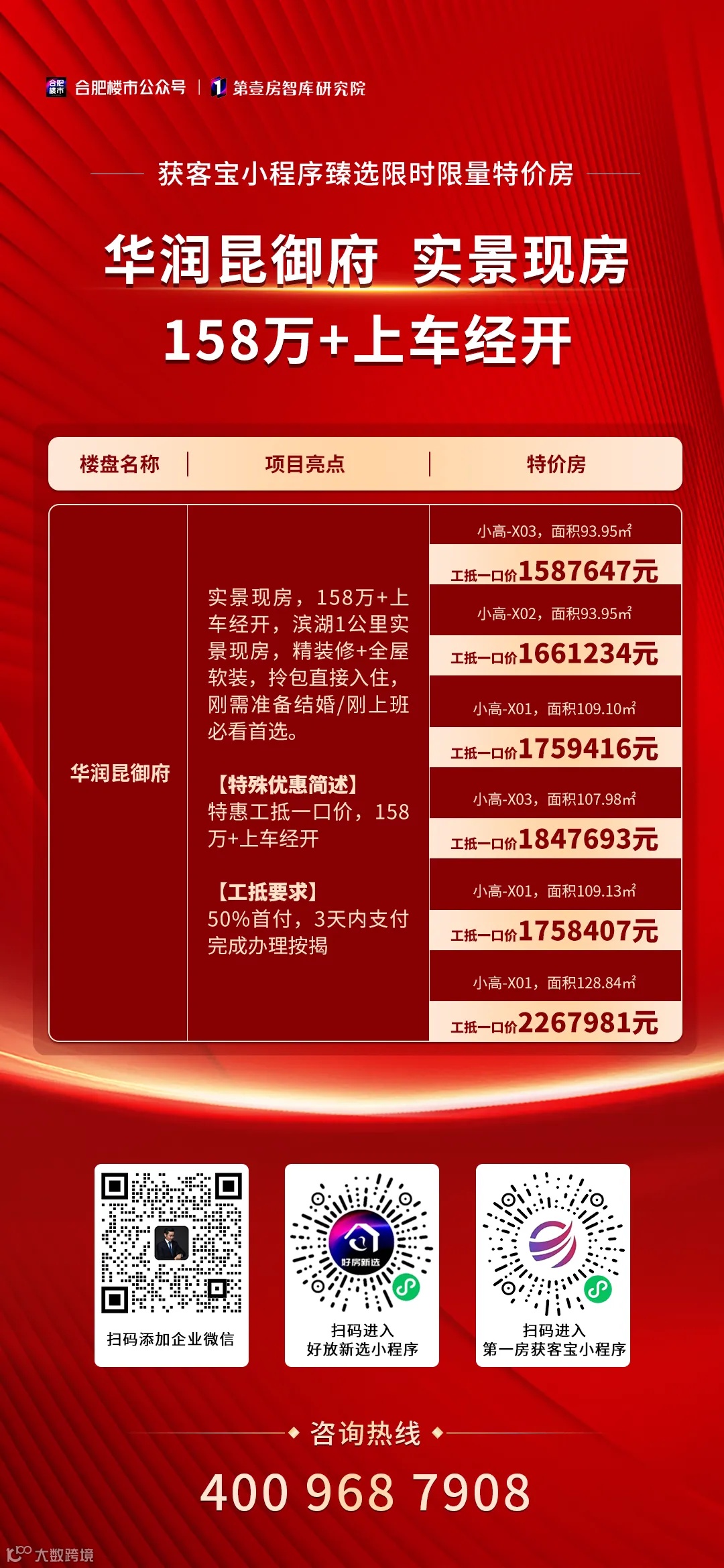 华润昆御府推出了多套工抵一口价房源,面积从93.95平方米到128.84平方米不等,工抵一口价最低至158万元。购房者可以享受特惠工抵一口价优惠,上车经开区更加轻松。