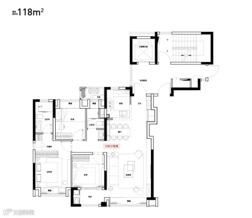 例如118㎡户型:同样为三室两厅两卫的设计,相比102㎡户型,其空间更为宽敞。主卧可能配备独立衣帽间和卫浴,提升生活便利性和私密性。同时,阳台区域可能设置大飘窗,拓展观景视野和空间感受。