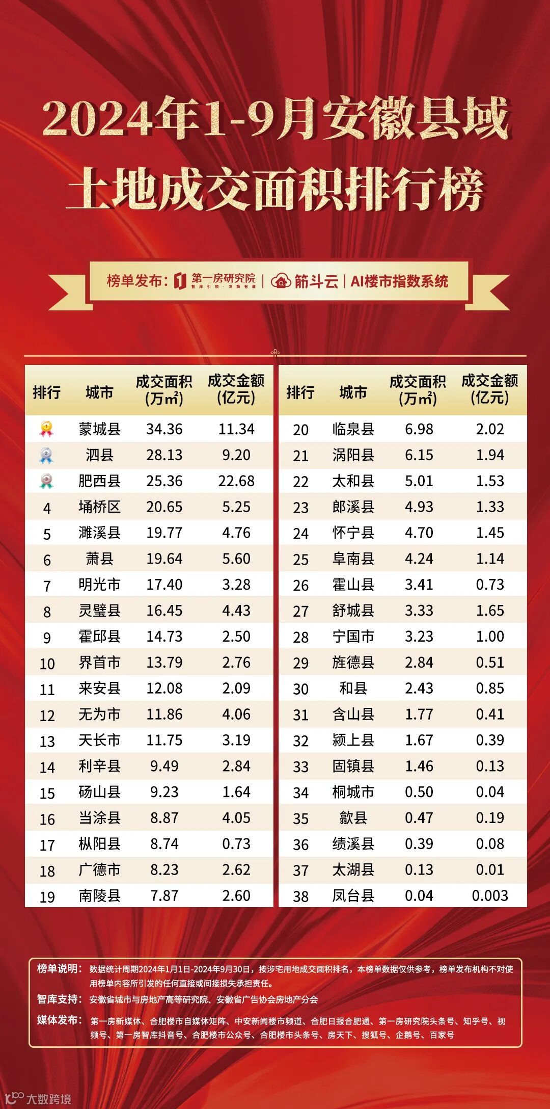 从县域土地成交情况来看,59个县域,仅有38个今年有土地成交,另外21个县域无土地成交。从排名来看,蒙城县成交34.36万方排名第一,其次是泗县成交28.13万方排名第二,肥西县成交25.36万方排名第三。