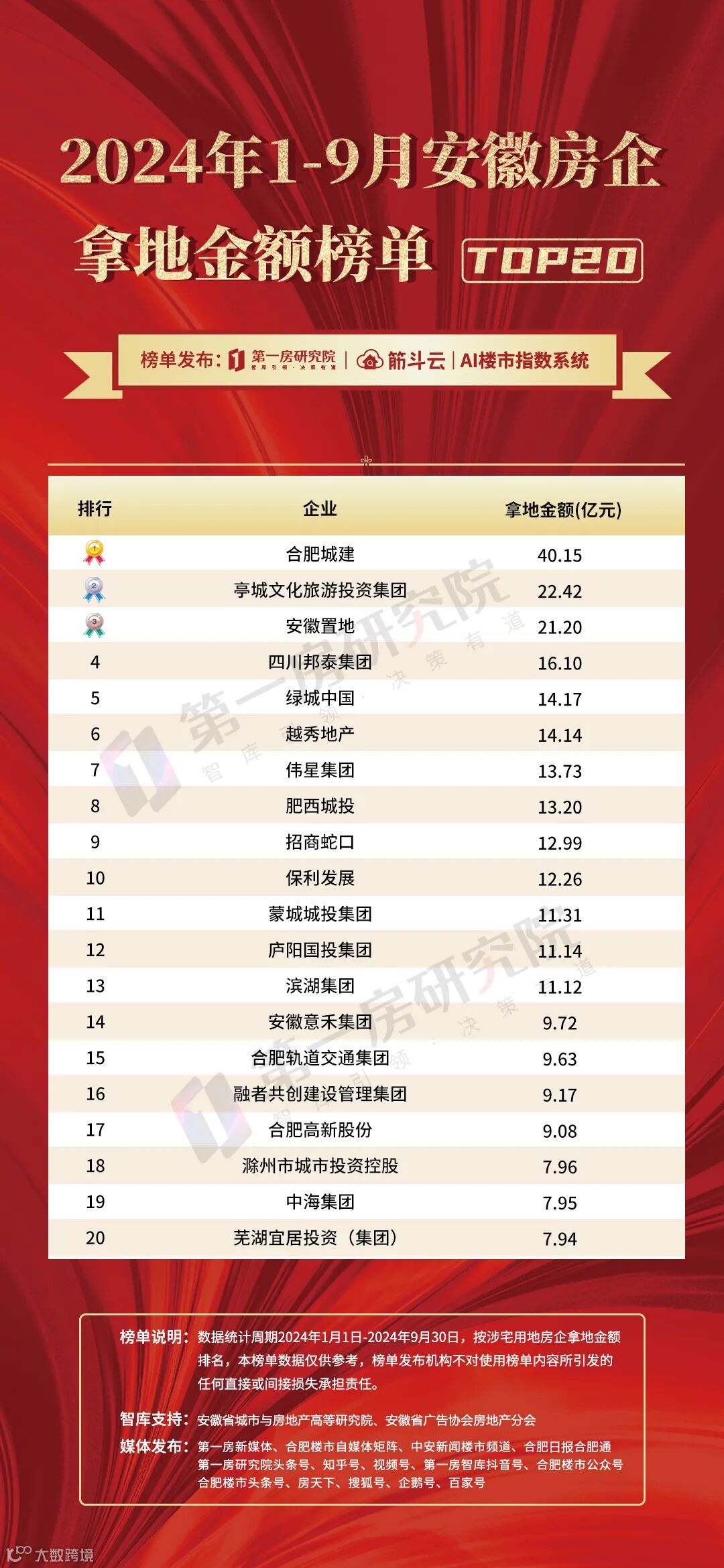 房企拿地金额来看,合肥城建以40.15亿元排名第一,其次是亭城文化旅游投资集团,以22.42亿元排名第一,安徽置地在合肥包河和经开拿了2宗地块,成交金额21.2亿元,排名第三。