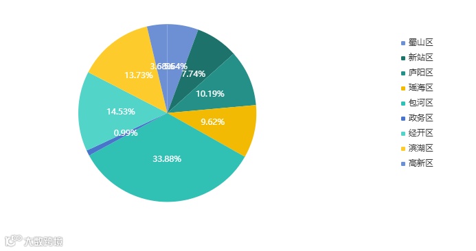 分区域来看,包河区成交面积占比33.88%,九区排名第一。经开区成交面积占比14.53%,排名第二。滨湖区成交面积占比13.7%,排名第三。