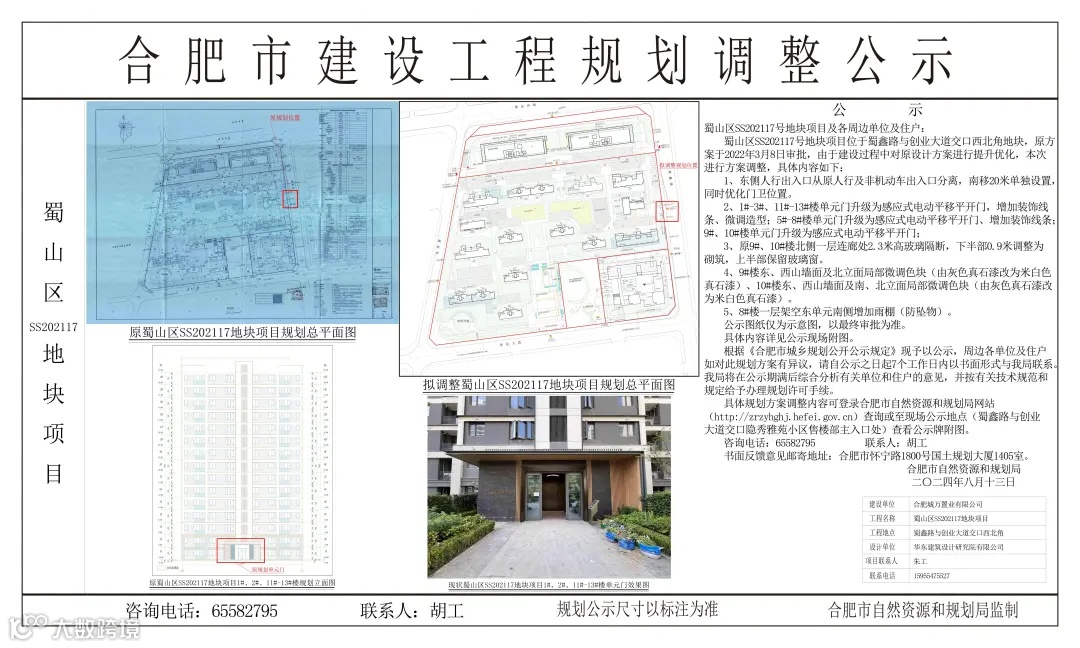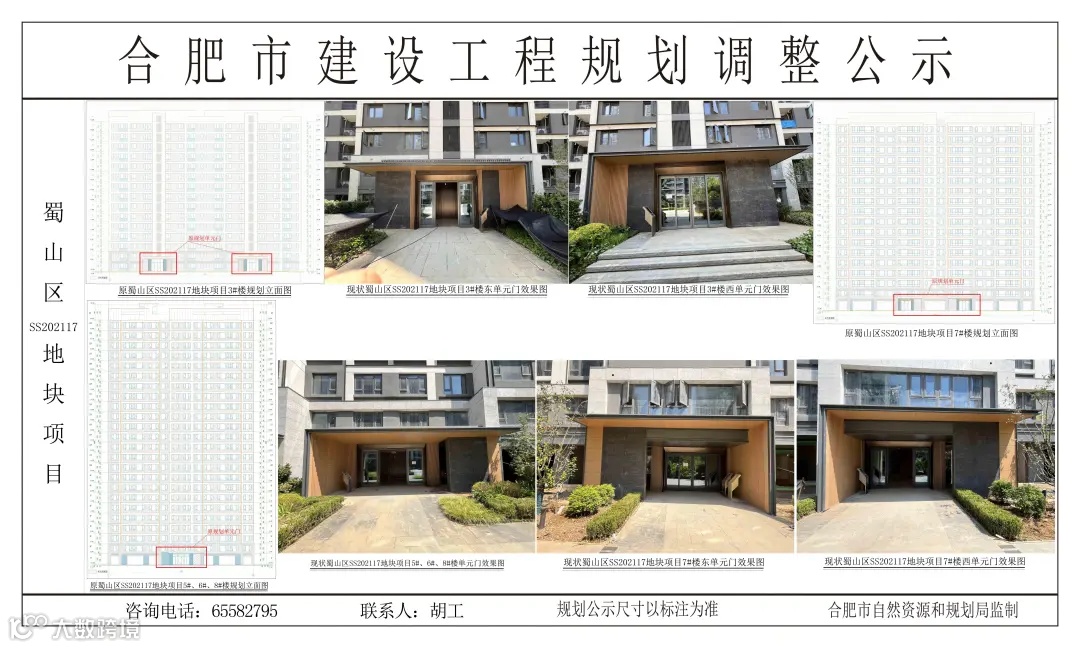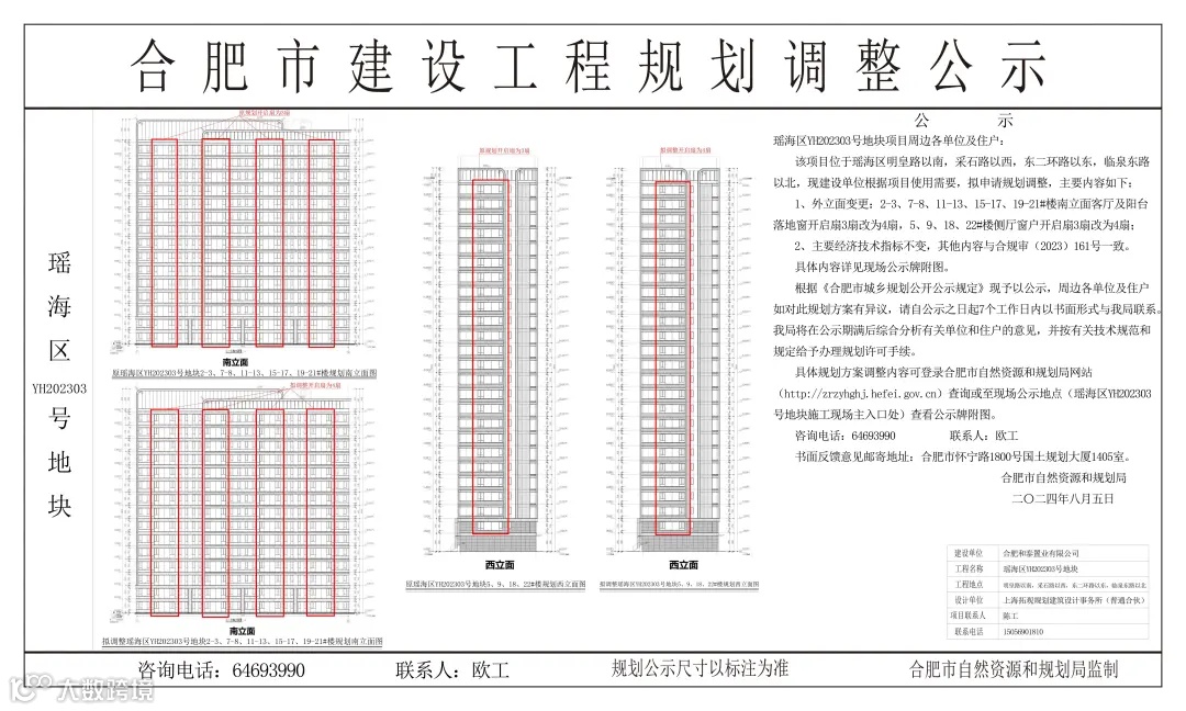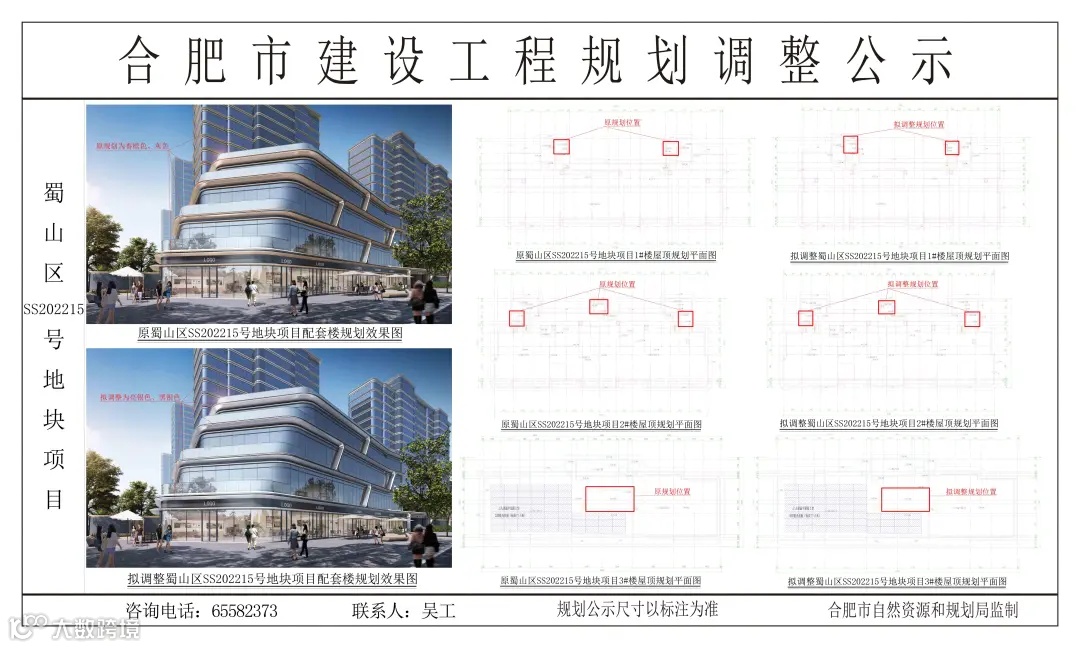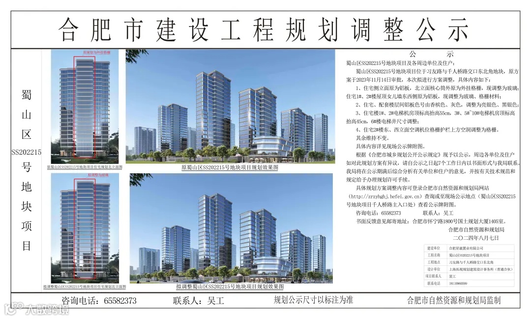 比如,住宅侧立面原为铝板,北立面核心筒外原为外挂格栅,现调整为玻璃;住宅1#、2#楼屋顶的女儿墙东西侧,由铝板调整为玻璃、格栅材料。