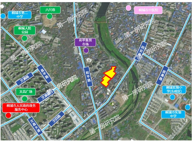 宗地位于文昌大道与同安南路交叉口西南侧。面积25.01亩,1.0≤R≤1.2。周边有西郊公园、文昌广场、六尺巷、桐城市第二中学、桐城市文昌小学、安徽省荣军康复医院、和平集贸市场等。邻近桐城市南门客运站,交通便利。周边景观条件优越,东侧为龙眠河。