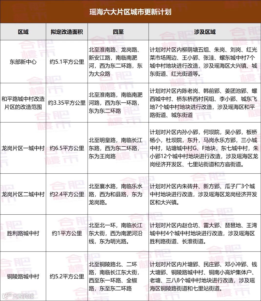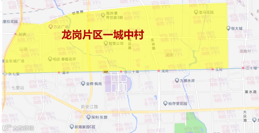 根据官方消息,瑶海这一次的城市更新,共涉及东部新中心、和平路城中村、龙岗片区一城中村、龙岗片区二城中村,胜利路城中村、铜陵路城中村6大片区,41个城中村,约23.55平方公里。