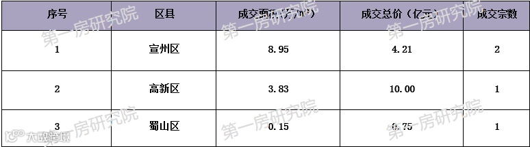 成交方面,有3个市县成交,成交宗数4宗,成交总价14.96亿元。