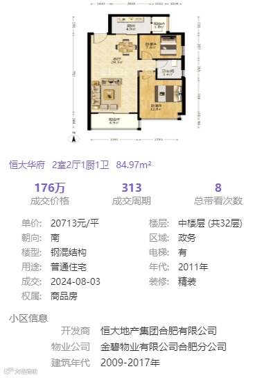 恒大华府本月成交一套85㎡中楼层房源,成交价2万/㎡。