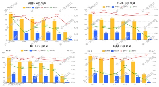 再来看看四大老城区,四大老城区存在大量的老破小,这也让区域总体价格较低,整体来看四大老城区成交价格呈下跌趋势,庐阳区因为老城区有优质教育资源,整体价格要比其他区域价格要高,瑶海区是四大老城区中价格最低的一个,8月成交价为1.07万/㎡,包河、蜀山价格为1.4万/㎡,庐阳区价格最高,为1.7万/㎡。