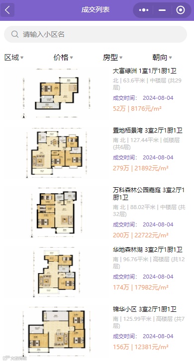 再来看看具体项目成交情况,最新庐阳区大富绿洲成交一套63.6㎡,成交均价仅8176元/㎡,置地栢景湾成交均价2.19万/㎡,万科森林公园成交价格2.27万/㎡,华地森林语成交价1.8万/㎡,锦华小区成交价1.24万/㎡。