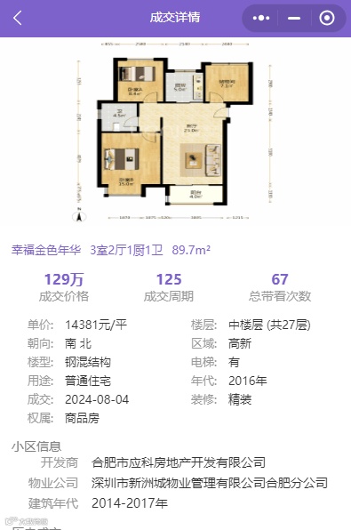 幸福金色年华8月份成交一套89㎡户型,成交均价1.4万/㎡。