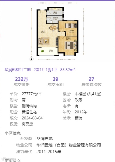 华润凯旋门成交一套83㎡户型,价格2.8万/㎡。