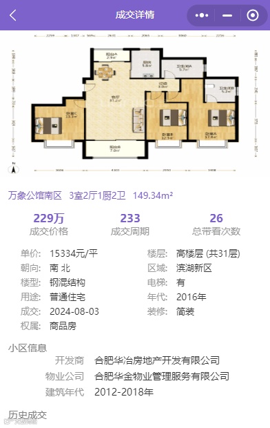 万象公馆一套149㎡户型,还是高楼层房源,成交价1.5万/㎡,对于品质要求不高的刚改或者改善购房者可以多关注一下。