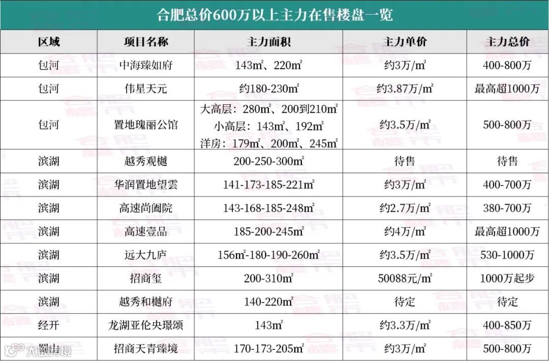 淝河板块的大户型产品,价格大多都在这个区间,以下楼盘可以重点关注,如正在验资,万象汇旁的中海悦府,这也是计容新政后首个入市的楼盘,杉杉奥特莱斯北侧的中交九宸、海上瑧悦也可以看下。