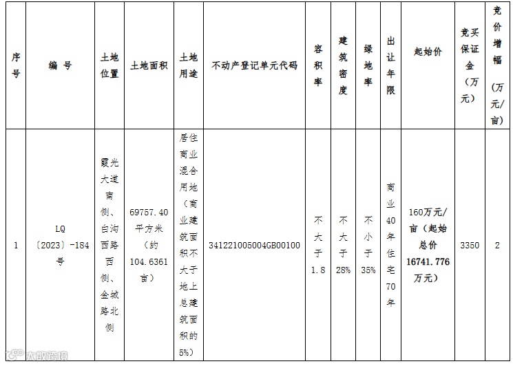 五、本次出让地块的详细资料和具体要求:详见《临泉县LQ〔2023〕-184号宗地国有建设用地使用权挂牌出让须知》。