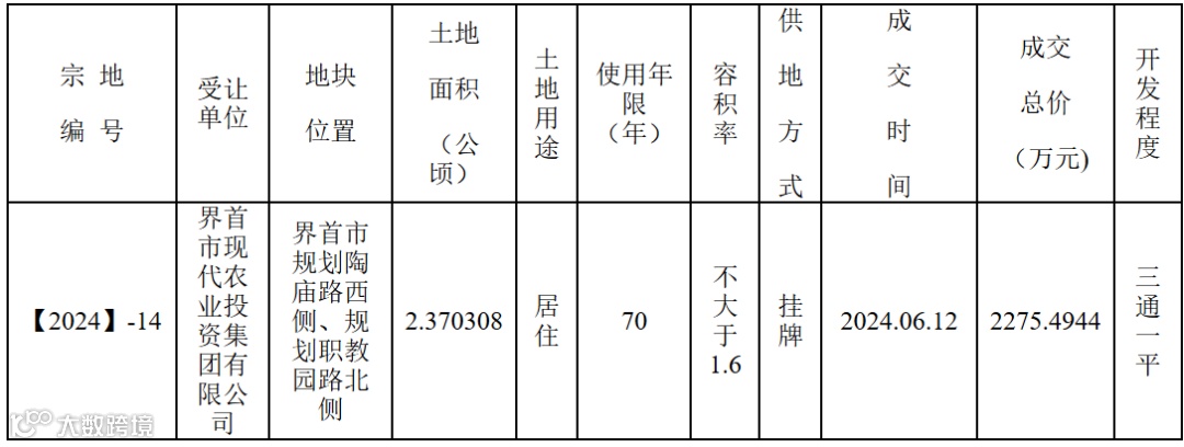 界首市现代农业投资集团有限公司拿下界首1总涉宅用地,成交价2275万元