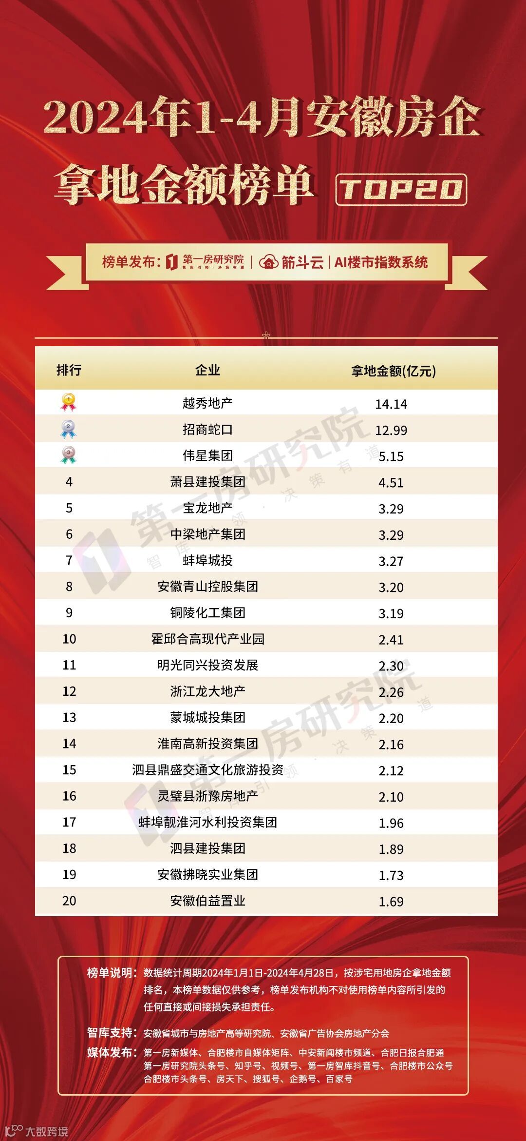 五、2024年1-4月安徽房企拿地金额榜单TOP20