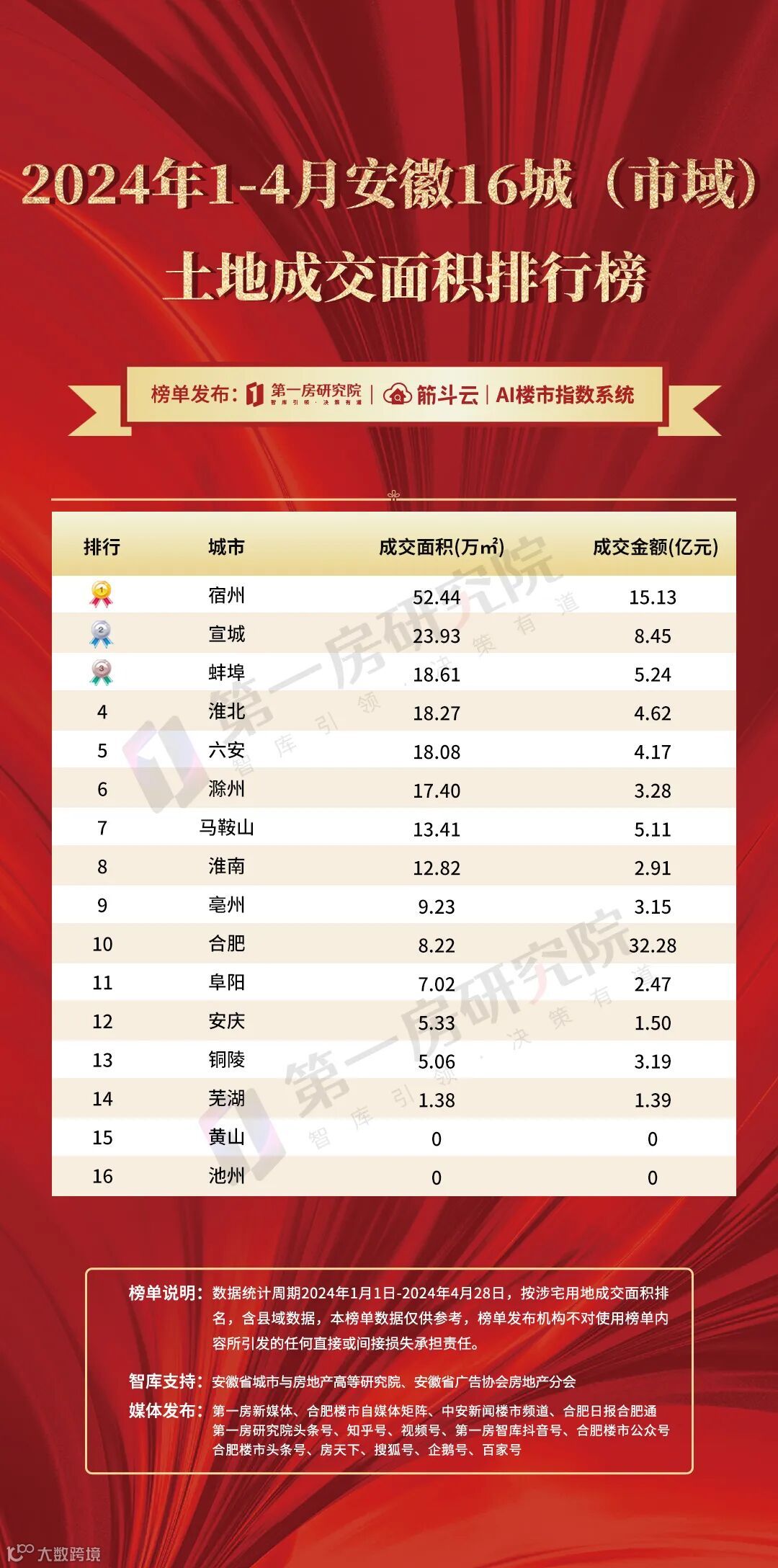 而在市区土地排行榜方面,2024年1-4月安徽16个城(市区)涉宅用地成交面积82.8万方(不含县域),成交金额56.6亿元,其中六安、滁州、安庆、黄山、池州等5城无土地成交。具体城市来看,仅蚌埠、淮南2城土地成交量突破10万方以上。淮北、宿州、合肥、宣城、马鞍山、铜陵等6城土地成交量在5万方以上。成交金额方面依然是合肥以绝对性优势排名第一。