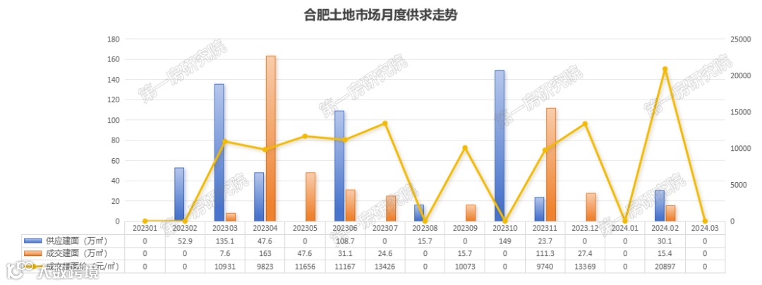 通过以上榜单分析不难看出全省各地市的土地市场相对来说比较艰难。从热度上来看,合肥相对于其他城市来讲更高一些。合肥2024年首拍出新地王,地价破3000万/亩,楼面价25050元/㎡;但同期出让的滨湖202403地块却以流拍收场,足以见得市场目前两极分化严重。分月度来看,合肥2023年土地市场先扬后抑,2024年2024年2月合肥市区供应4宗(滨湖3宗,包河1宗),成交3宗(滨湖2宗,包河1宗)。BK202403地块由于地块由于位置相对较偏,且南侧为地铁车辆段,不利因素较多,叠加金融板块竞争压力较大,导致最终流拍。