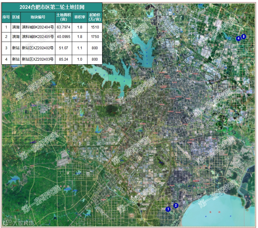 本轮土地出让累计4宗,滨湖2宗均位于金融后台板块,2宗位于新站少荃湖北岸,合计约240.2亩。本轮土拍保证金截止时间为2024年5月7日下午16∶00,拍卖时间为2024年5月10日。