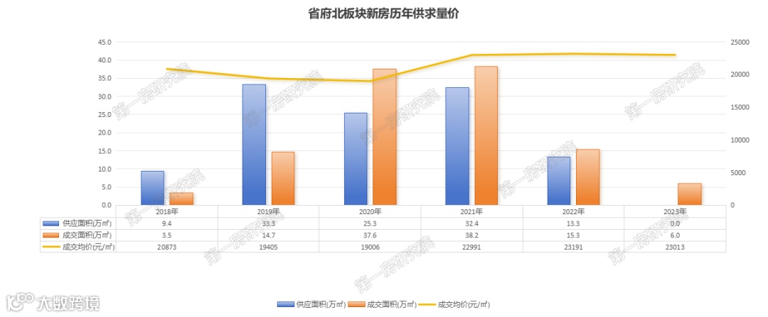 新房市场方面,省府北板块近6年年均供应19万㎡,年均成交19.2万㎡,供求几近平衡。成交价方面,近6年新房价格上涨约2140元/㎡。从成交走势来看,板块成交量受供应量影响比较大。2019-2021年为板块供应和成交的高峰期,2022年开始,板块受在售项目减少的影响成交量在逐年走低,但板块均价站稳2.3万/㎡。