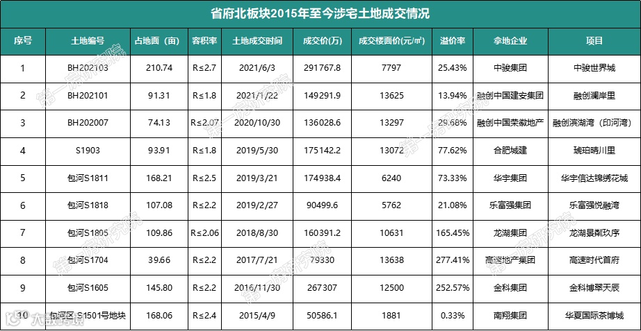 再来看看省府北板块的市场情况。根据第一房研究院Ai楼市指数系统统计数据显示,省府北板块近9年来累计成交涉宅用地10宗,19年为该板块土地出让的高峰期,乐富强悦融湾、华宇信达锦绣花城、琥珀晴川里便是那个时候成交的土地。而该板块最近的一场土拍则是在2021年的合肥第一批次土地出让,当时的中骏以总价291771.12万元竞得包河区BH202103号地块,居住单价1995万元/亩,居住B地块楼面价13010.8元/㎡,商住混合D地块居住楼面价11969.94元/㎡,居住E地块楼面价13010.8元/㎡,溢价率27.88%,竞自持面积53800㎡,当时的板块土地市场热度极高。