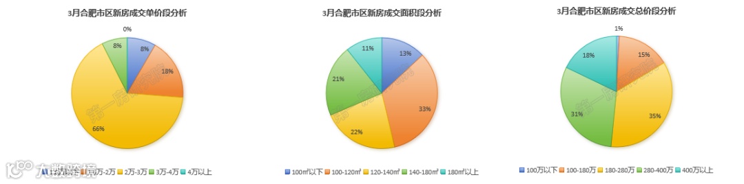 从3月合肥市区新房结构性成交来看,2-3万的房源占比接近7成,可以看出,此类房源在一定意义上代表了合肥现在的新房成交价。面积段方面,100-120㎡的房源占比超3成,为3月成交量最多的面积分段,但如果看140㎡以上的房源成交量,占比为32%,由此可见,3月刚需房源和改善型房源旗鼓相当。总价段方面,180-280万的房源成交占比35%,为3月成交量最多的总价分段,但如果看280万以上的房源成交量,占比接近5成。可以看出,合肥现阶段的新房成交套均水平280万以上常态。整体来看,3月合肥市区新房成交以改善型产品和刚改产品为主,其次是刚需。