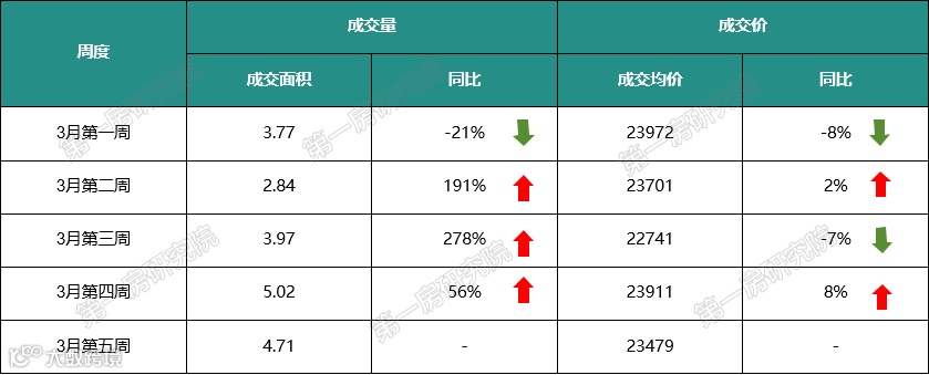 从周度成交方面来看,3月从第二周开始成交量连续上涨3周,成交价涨跌参半,整体价格跌幅大于涨幅。整体3月呈现出量涨价跌的趋势。